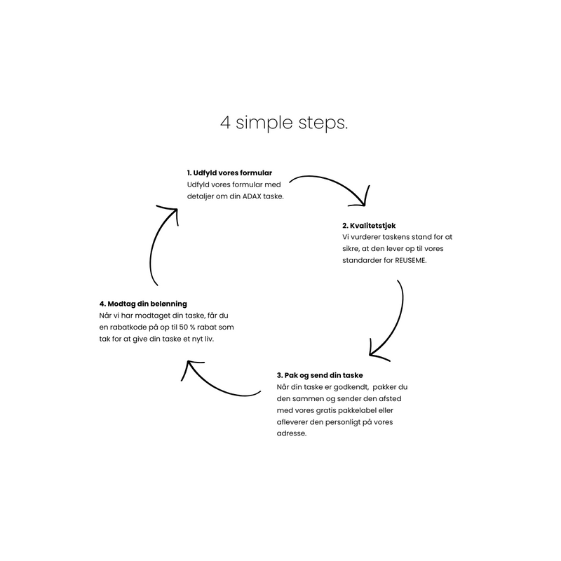 ReuseMe er et konceptet, hvor du kan indlevere din brugte Adax-taske, der stadig har mange år tilbage at blive elsket. Som belønning får du en rabatkode på op til 50%, som kan bruges på en ny taske på vores webshop. Den indleverede taske får en grundig vurdering, så den kan blive solgt videre til en ny ejer.