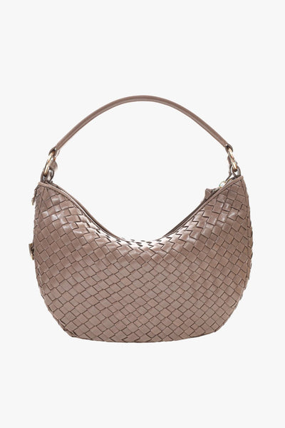 En elegant skuldertaske med et smukt flettet design. Den har to aftagelige remme: en kort til skulder eller hånd, og en længere justerbar rem til crossbody-brug. Begge remme fastgøres elegant til de fine metalringe, så du nemt kan ændre udtrykket. Det rummelige hovedrum suppleres af to indvendige lommer, heraf én med lynlås, som giver både stil og praktisk organisering.