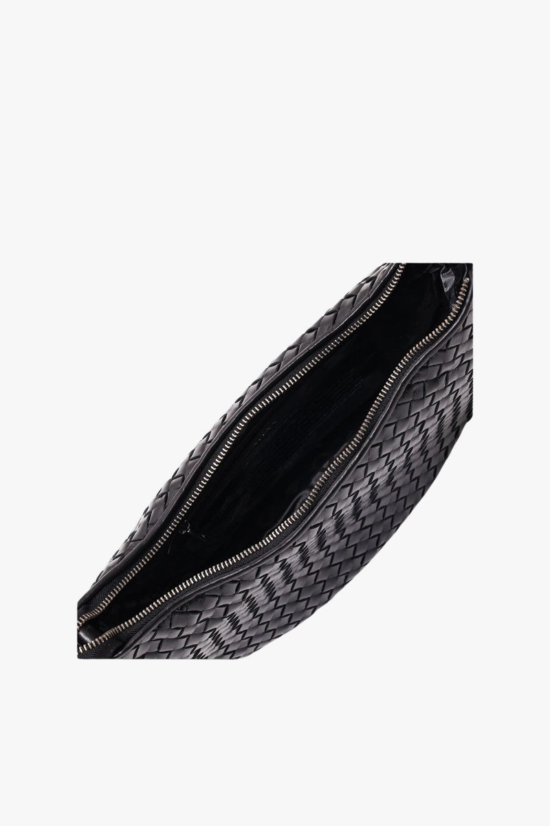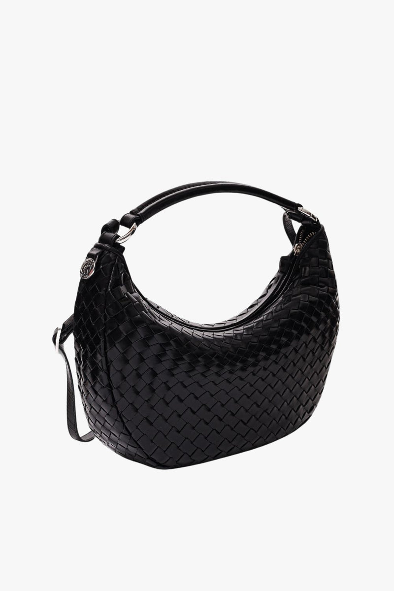 En elegant skuldertaske med et smukt flettet design. Den har to aftagelige remme: en kort til skulder eller hånd, og en længere justerbar rem til crossbody-brug. Begge remme fastgøres elegant til de fine metalringe, så du nemt kan ændre udtrykket. Det rummelige hovedrum suppleres af to indvendige lommer, heraf én med lynlås, som giver både stil og praktisk organisering.